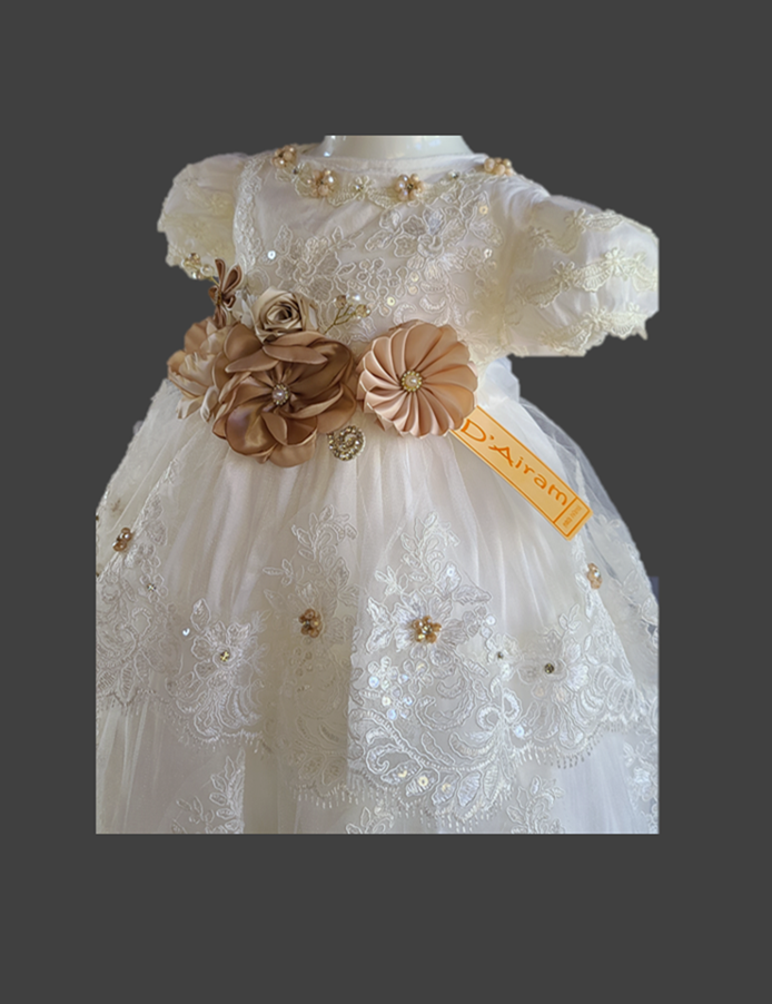 - Bordado artesanal, cristal, flores y zirconias.